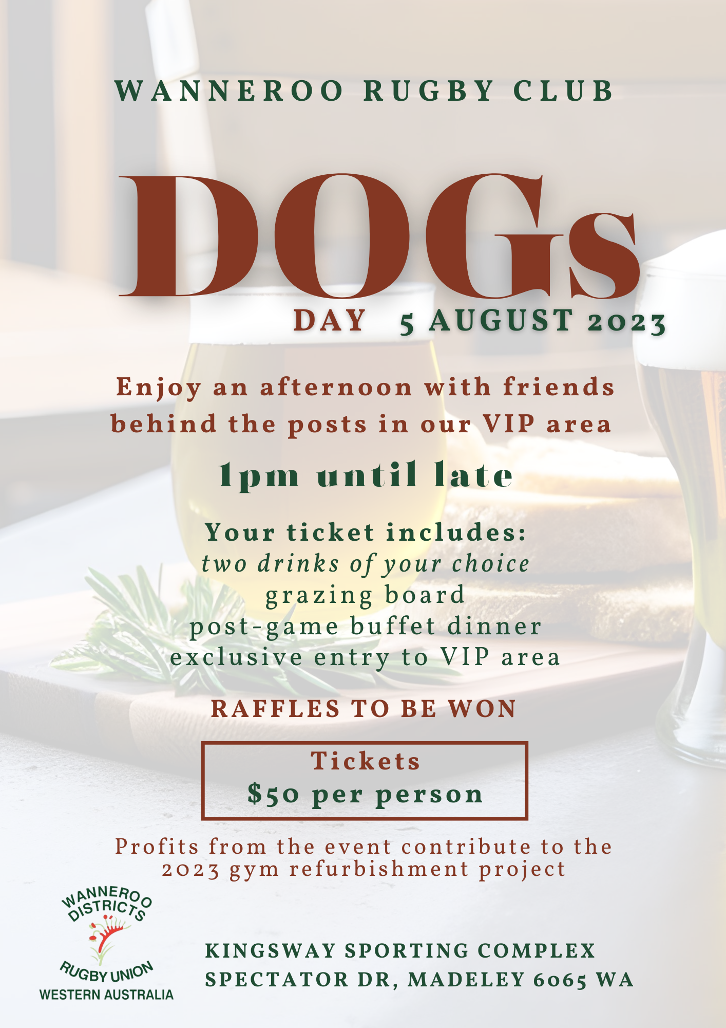You’re invited to an entertaining afternoon behind the posts (in front of the club house) in our VIP marquee. Graze and sip as the Roodogs battle it out with Cottesloe. Watch all our senior teams play at home!